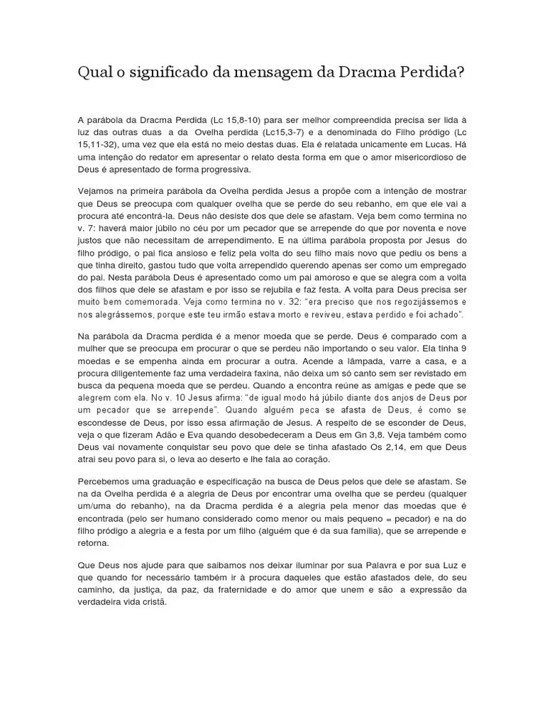 A parábola da dracma perdida mostra a diligência de uma mulher que ao perder algo precioso foi à sua procura, sem hesitar... A parábola da dracma perdida faz parte do conjunto de parábolas que jesus contou em lucas 15 para ilustrar o amor de deus pelos pecadores. Nas três, jesus faz referência a algo de grande valor que havia sido perdido, mas, que foi encontrado. Na parábola da dracma perdida, fala de 10%... A parábola da dracma perdida faz parte do conjunto de parábolas que jesus contou em lucas 15 para ilustrar o amor de deus pelos pecadores.